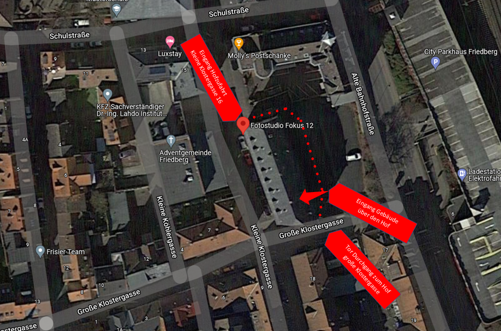 Der Eingang befindet sich im Hof, den Du durch das kleine Tor Ecke Große Klostergasse / Kleine Klostergasse, über eine kleine Treppe erreichen kannst. Falls das Tor verschlossen sein sollte gehen bitte über die Hofzufahrt Kleine Klostergasse 16 in den Hof.